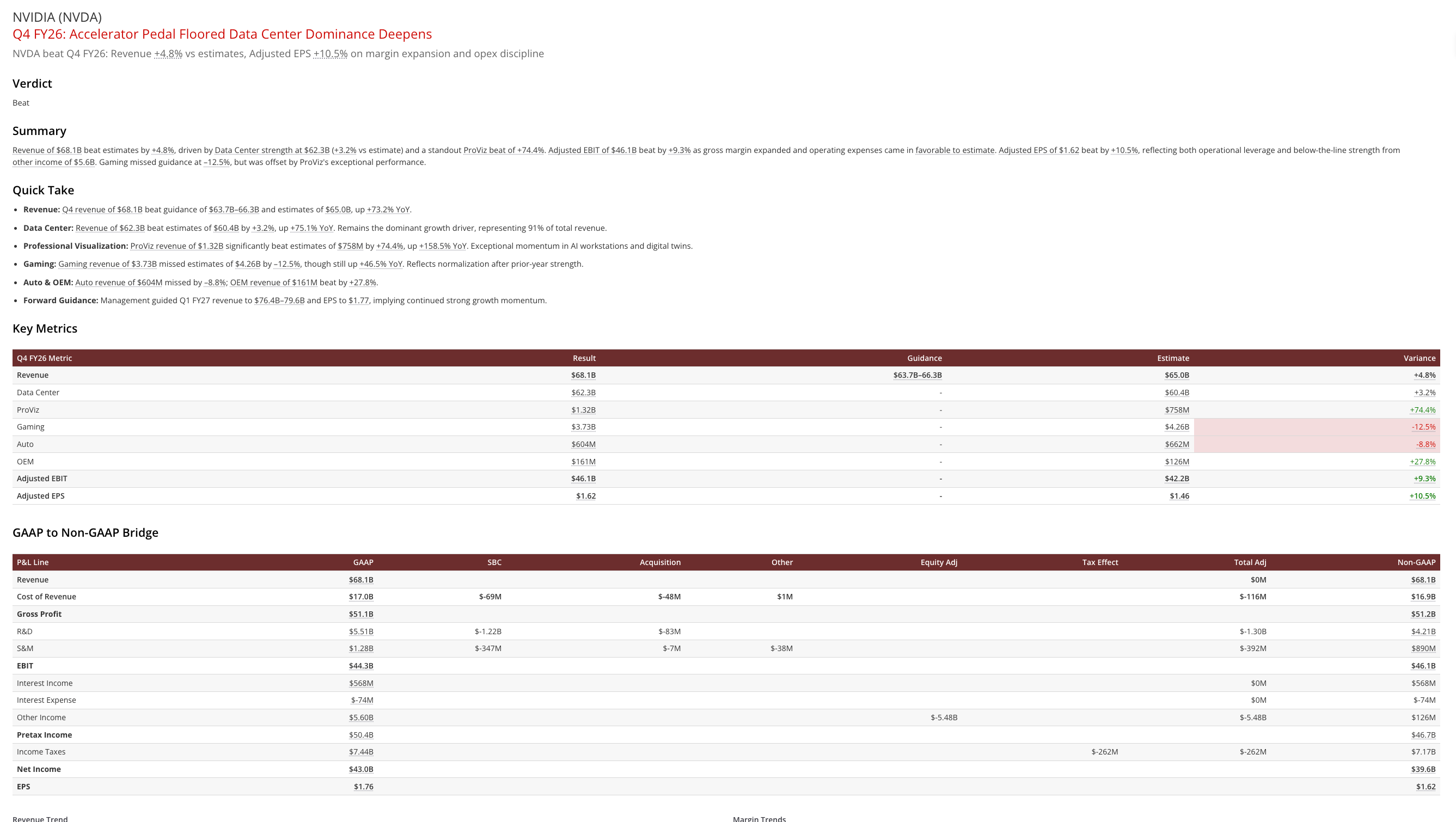 Every Jesse report includes structured financial tables: segment revenue vs. estimates, variance callouts, and a full GAAP to non-GAAP reconciliation automatically populated from the filing.