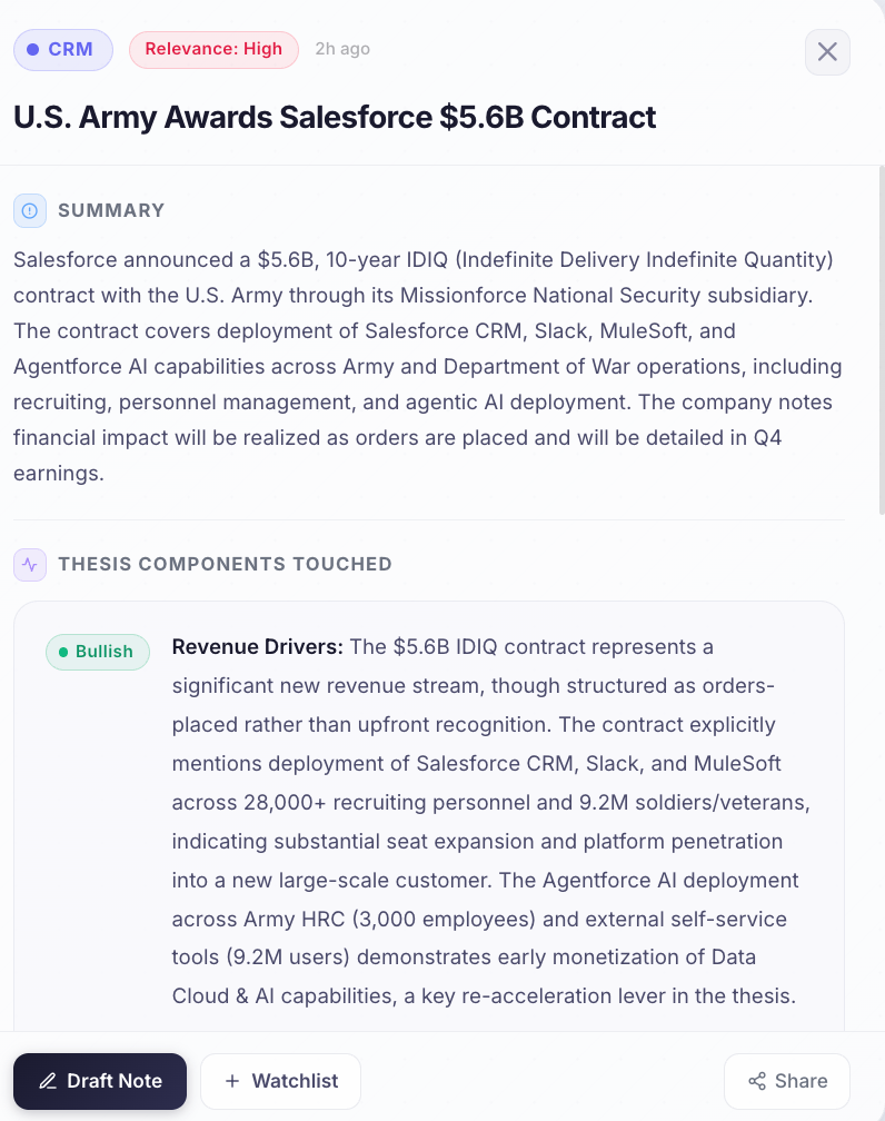 When Jesse reads a news article, it maps every data point to specific thesis components and assigns a sentiment. This is the Core Thesis Engine reasoning out loud.